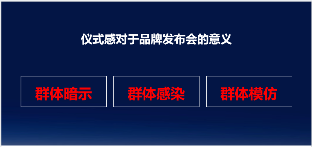 关于仪式感的起源,甚而可以追溯到周公的“制礼作乐”。对于品牌而言,我们一直有一个观点叫:只有仪式感,才能吹响冲锋号。家居行业以渠道为驱动,本质就是以人为驱动,更呼唤仪式感。仪式感之于品牌发布会的意义在于:群体暗示、群体感染和群体模仿。法国社会心理学家勒朋认为,处于激动的人群中的个人具有很强的“被暗示性”。一场具有仪式感的发布会,周围人的话语、表情、动作乃至现场的氛围,对他都成为有力的暗示刺激,使他的信念、思维和行为方式,迅速与现场的人群融为一体。这让我联想到了2016年我们为服务客户迅达策划的品牌战略发布会,将会议选址定在钓鱼台国宾馆,以经销商为主的与会嘉宾,当他踏入会场的那一刻起,立马变得“正襟危坐”起来。所以,对于一场发布会而言,会议的选址就是一场关于仪式感的暗示。发布会现场亢奋的氛围中,某种程度上,会让与会嘉宾失去理性的自控能力,而对于来自外部的刺激表现出一种本能的反应。如一人大笑,全场跟着大笑起来,是再正常不过的一件事。经过这种群体感染过程,一种情绪、一种观点会迅速支配整个人群,并迅速引发整个人群的激烈行动。这就足以对于一场发布会而言,发布会的内容(即演讲者的演讲PPT)就显得尤为重要。PPT的本质是为与会嘉宾拍照用、媒体传播用,我们大张旗鼓张罗发布会,无非就是希望通过这场会,让其记住什么、播传什么。模仿是法国社会心理学家塔尔德提出的概念。他在《模仿律》一书中提到:社会上的一切事物不是发明,就是模仿,而“模仿是最基本的社会现象”。集合中的模仿,更多地表现为无意识的、条件反射性的模仿。从心理学来解读就是,这种模仿与人的安全(或防卫)本能有着密切的关系。在一场大会中,每个人都希望与在场的多数人保持一致,作为他最有效的安全选择。这也是为什么很多行动的冲锋号要通过“会”来动员,其原理就在于此。以上,我们通过群体暗示、群体感染、群体模仿三者传播学的概念,为大家揭示了开好一场具有仪式感的发布会的重要性。(搜索公众号:汤飞)但这还不够,除了“开好”这场发布会的动作,还需要“传播好”这场发布会的动作,这个动作就是开头所提到的“公关战役”的动作。