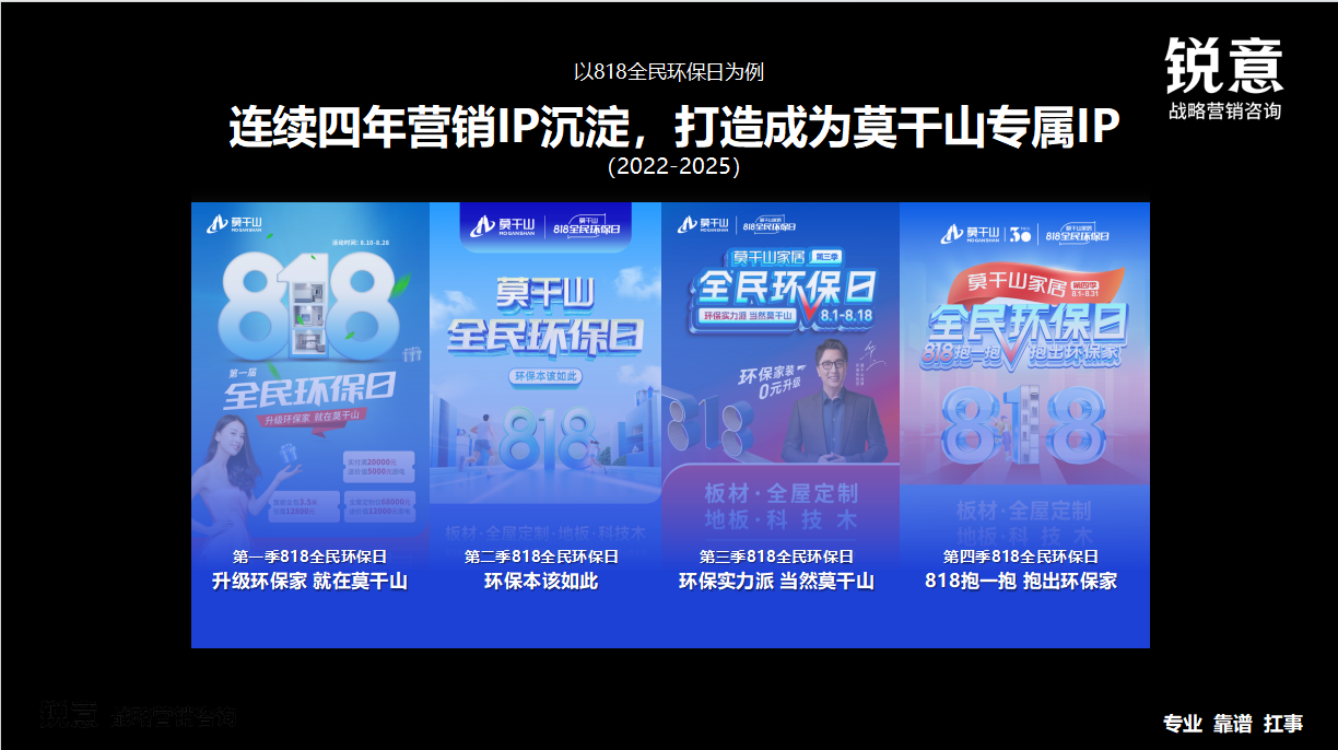 莫干山的品牌体系打造上,也体现出战略远见。围绕自身的品牌和品类价值,构建了“超级品牌日、全民环保日、实木定制节、零碳战略”,一年三会一节,通过节日,制造记忆;通过记忆,制造文化;通过文化,制造归属。品牌势能,就这样在固定的节奏中,一点一点垒起来。